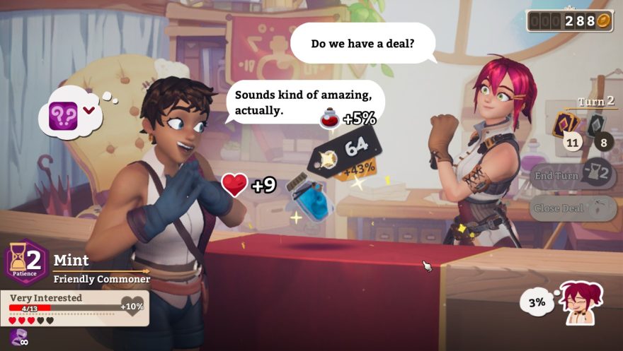 La gestion de la boutique est également un aspect clé de Potionomics. Vous devez non seulement produire des potions, mais aussi les vendre à un prix compétitif pour rembourser vos dettes. Cela nécessite une analyse constante des tendances du marché, de la concurrence et des besoins des clients. Le processus de vente est enrichi par un mécanisme de négociation basé sur des cartes, où chacune de celles-ci représente une action ou une compétence utilisée pour persuader les clients d’acheter à un prix plus élevé. Les clients ont des humeurs et des attentes variables. Il est donc essentiel de gérer habilement votre stock et de répondre aux exigences des tendances commerciales pour maintenir un flux de trésorerie stable.
