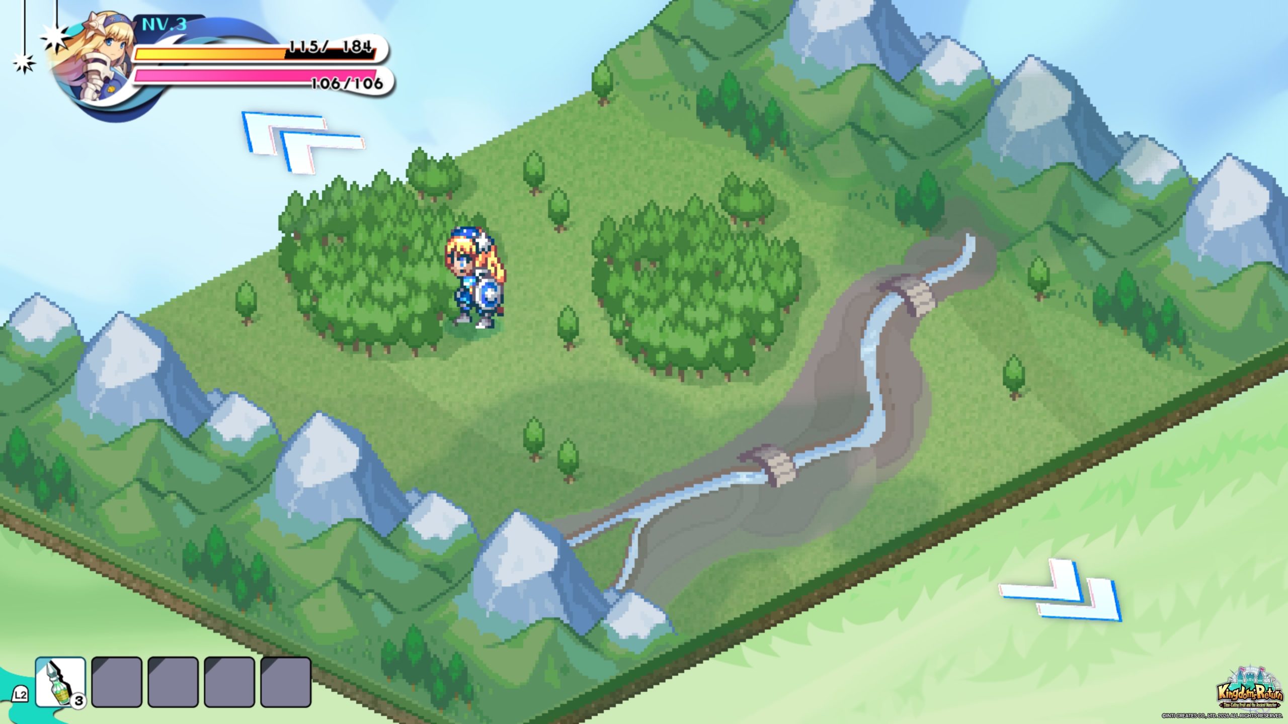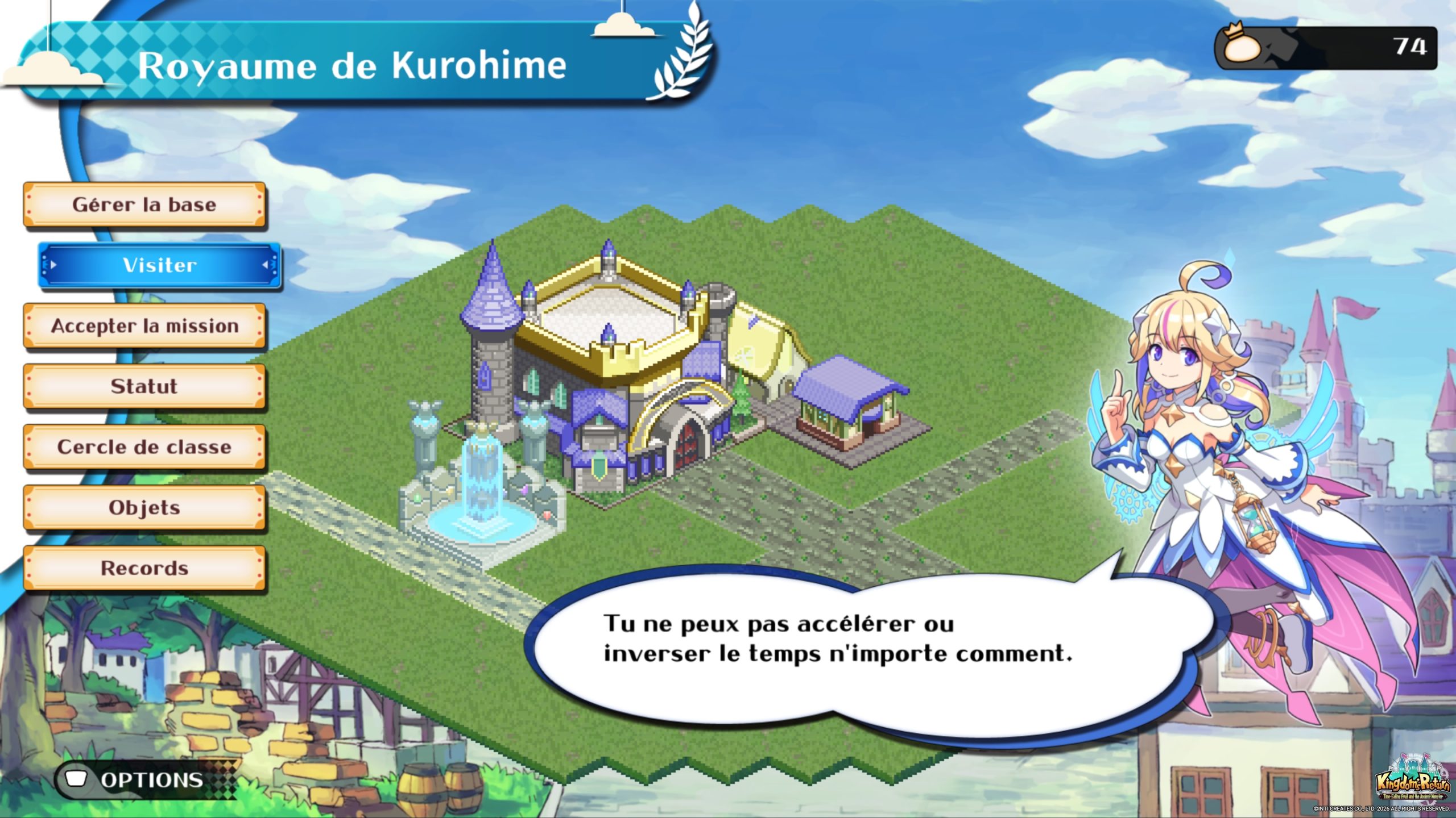 Il y avait pourtant matière à ouvrir sur autre chose. Un royaume effondré, rongé par le temps, des terres qui n’attendent plus qu’une main pour relever leurs murs, et cette étrange Chronos qui accompagne le héros comme une promesse. On imagine alors une quête portée par les ruines. Une aventure qui ferait de chaque pierre replacée un fragment d’histoire retrouvé. Pourtant, le scénario n’aide en rien à vouloir s’immerger dans ce monde. Le point de départ reste extrêmement basique. Le protagoniste doit aider le royaume déchu d’Almacia à retrouver sa grandeur avec le soutien de Chronos, la fée du temps. Ce cadre aurait pu au moins servir de prétexte efficace à l’aventure, mais le jeu ne construit presque rien autour. Les dialogues optionnels en ville se limitent souvent à quelques échanges sans relief, à des remarques anecdotiques ou à des indications de gameplay déguisées en conversations. Il n’y a pas vraiment de personnages qui prennent forme, pas de tension narrative, pas de montée en puissance. Pendant une bonne partie de l’aventure, le récit semble tout simplement absent.
